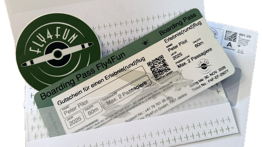 Ob Rundflug, Schnupperflug oder ein Stundengutschein für Piloten von Fly4Fun: Wähle deinen gewünschten Gutschein, fülle das Bestellformular aus und schon machen wir deinen personalisierten Fly4Fun-Gutschein in Form eines Boarding Tickets bereit.